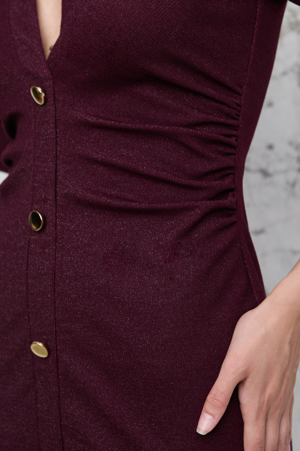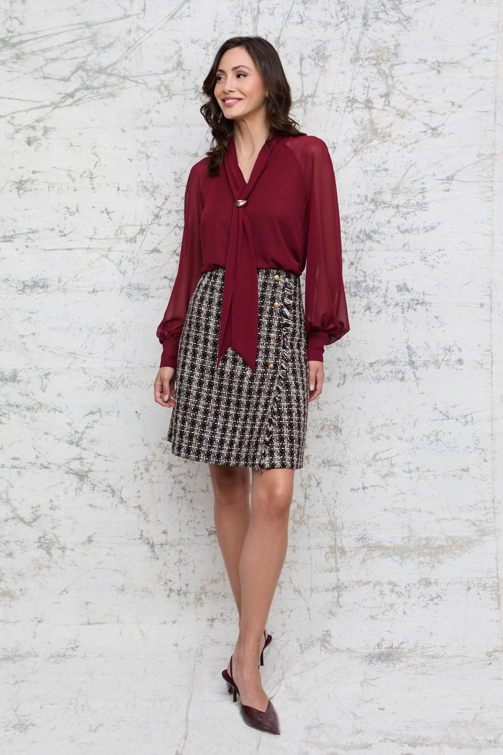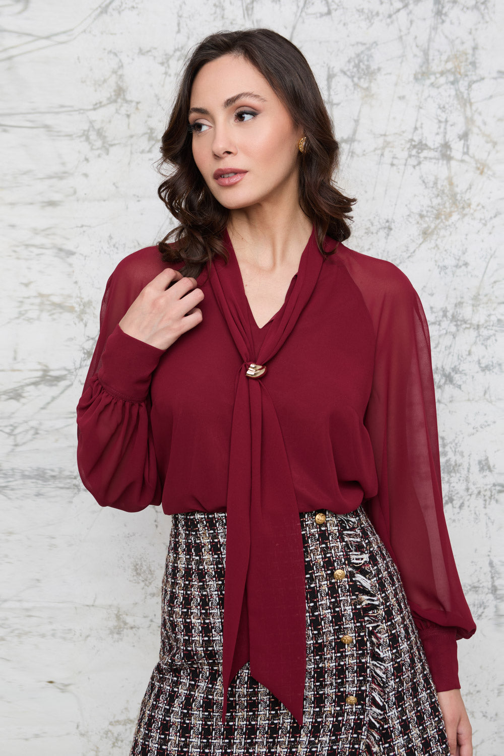 Chic Burgundy Tie-Neck Μπλούζα με Διαφάνεια στα Μανίκια